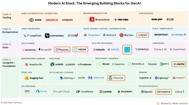 The modern AI stack is undergoing a transformation, shifting from early experimentation to a structured framework that drives enterprise innovation. The new stack is built on four key layers—Compute & Foundation Models, Data, Deployment, and Observability—each enabling enterprises to harness AI's potential efficiently and securely. This evolution has redefined AI development, moving from labor-intensive ML pipelines to product-first approaches powered by advanced large language models (LLMs). As enterprises embrace this new paradigm, they unlock opportunities to innovate faster, reduce costs, and democratize AI capabilities across teams.