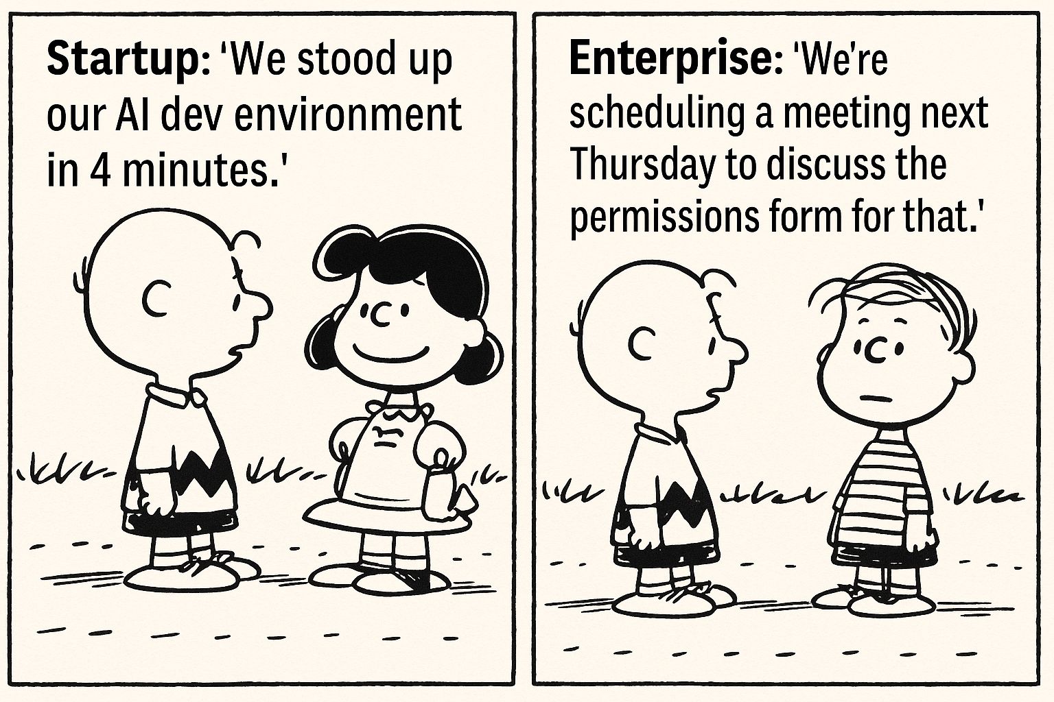 In an enterprise, that same setup can take months—not because the tech is slower, but because the organization is.