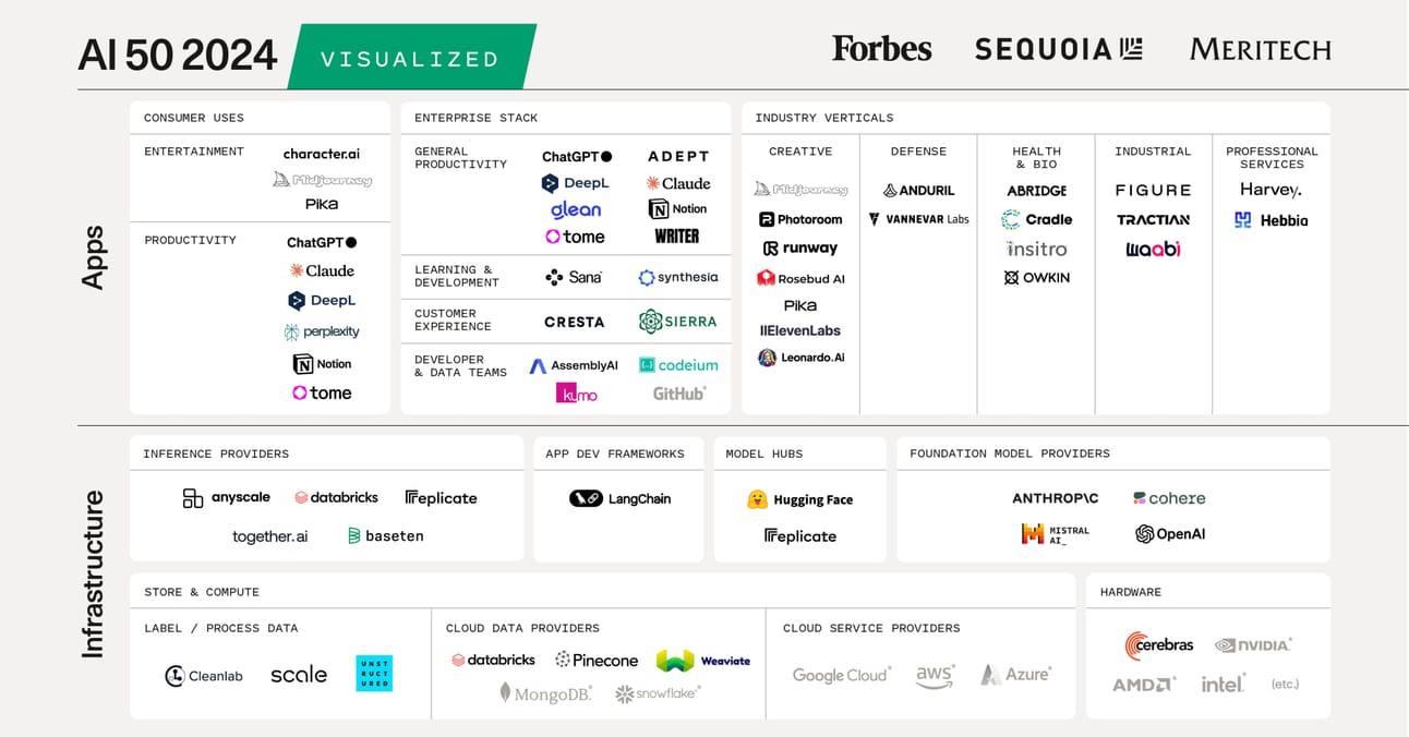 Generative AI is leading a productivity revolution, transforming industries and reshaping the AI application landscape. The 2024 AI 50 list highlights this evolution, showcasing companies driving innovation through AI-powered tools, infrastructure, and agentic systems. As AI integrates further into workflows, it promises to redefine business operations, lower costs, and create new opportunities across industries. From enterprise to consumer-level applications, this is just the beginning of a generative AI-driven future.