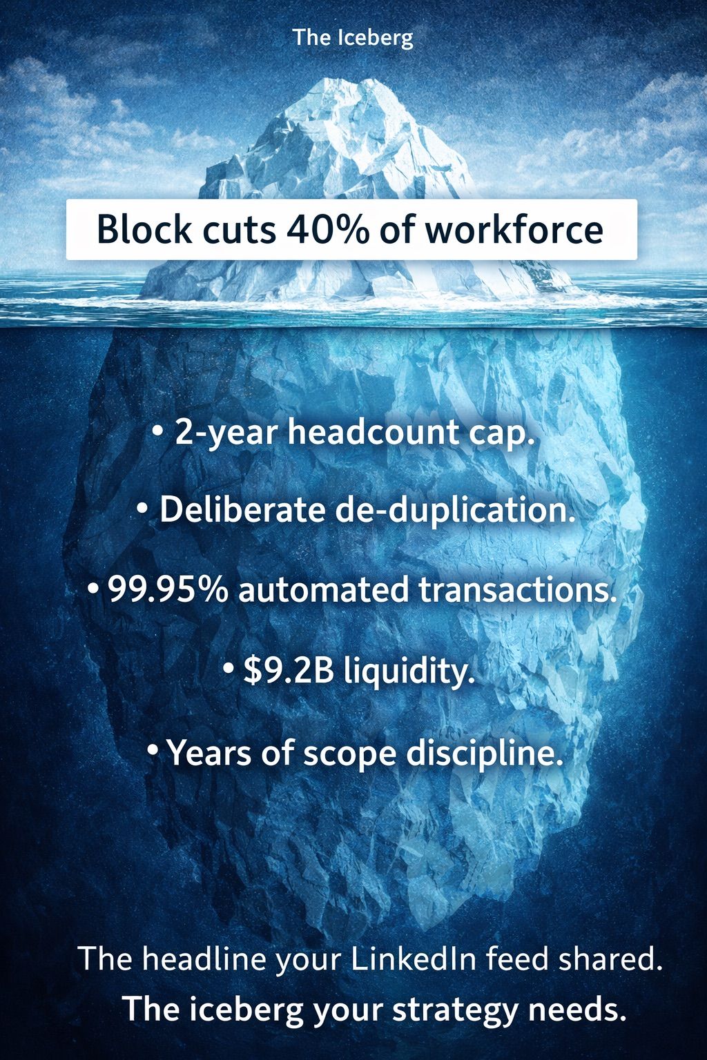 Read that again. Block didn't cut because revenue collapsed. It cut because leadership believes "intelligence tools" have permanently changed what it means to build and run a company. That is a different argument than "macro headwinds" — and it carries a different weight. Jack Dorsey's memo described a deliberate choice to execute a single deep cut rather than repeated rounds, framing staged reductions as "destructive to morale." He's right about that. Every leader who has lived through three rounds of layoffs in 18 months knows what happens to the culture in between — people stop investing and start optimizing for survival. The severance package — 20 weeks of salary, one additional week per year of tenure, six months of health care, and $5,000 in transition support — signals a leadership team that had the financial capacity to protect departing employees rather than just protect the balance sheet. I have deep respect for that choice. One clean cut, done with dignity. That is what accountable leadership looks like.